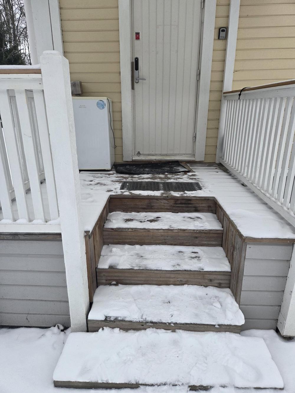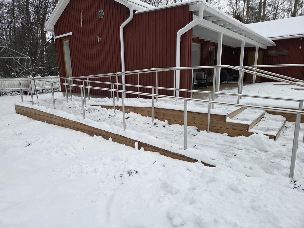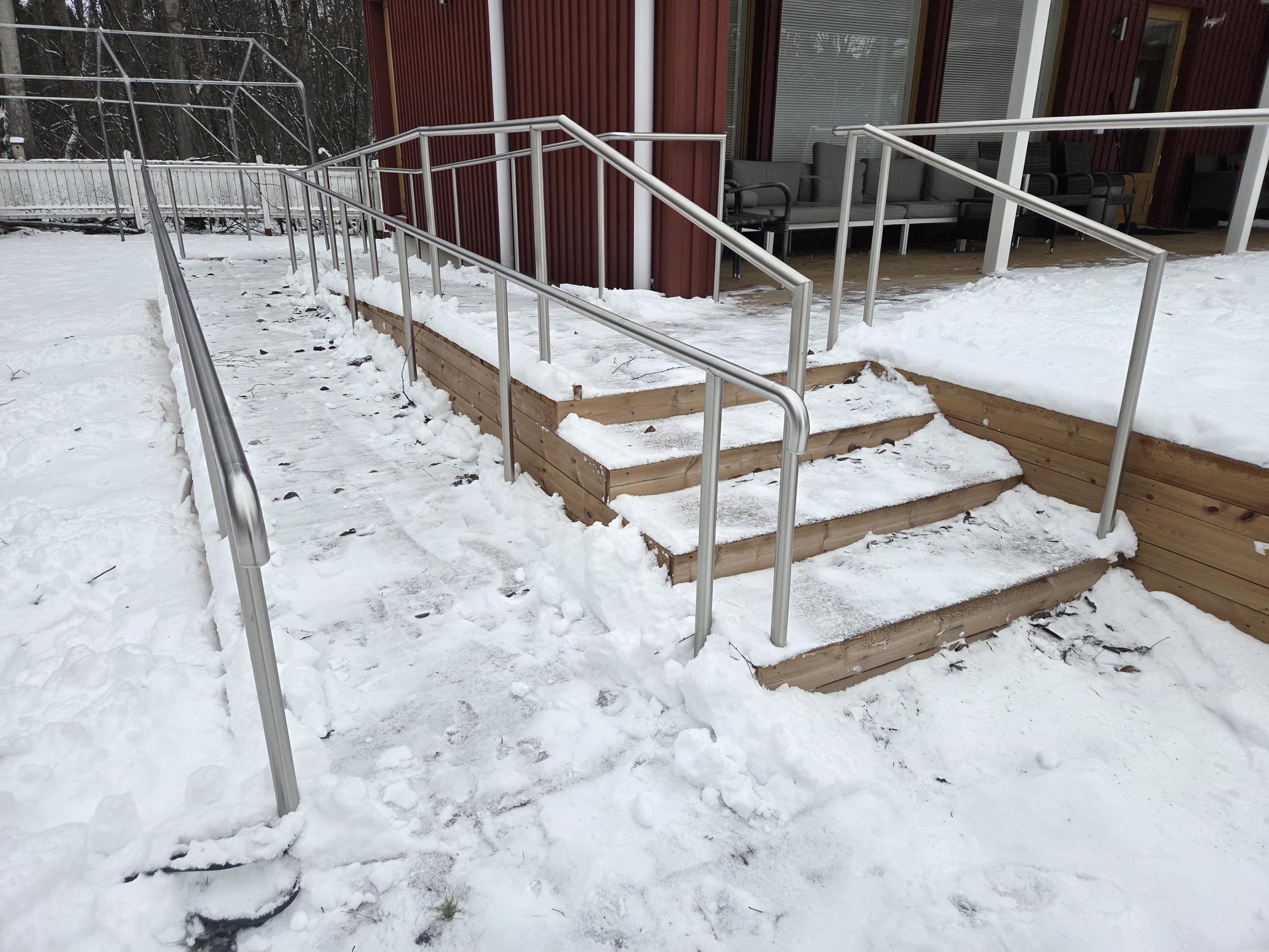 Sauna- ja kokoustilan kuistille pääsee portaita ja ramppia pitkin. Kuistia ei voi hiekoittaa, joten se voi olla talvisin liukas.